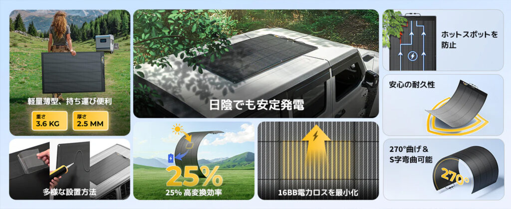 このパネル、単なる携帯型ソーラーではなく、「軽量 × 高効率 × 影に強い」という三拍子揃った革新技術を搭載しています。