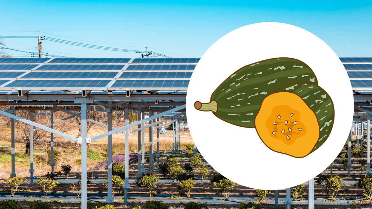 ブルーベリー、菌床シイタケ、万次郎カボチャの3品目を栽培し、年間約29万kWhの発電と地域食材の生産を両立。