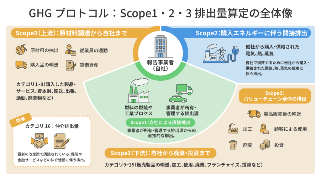 排出量はその発生源によって「スコープ」に分けて整理されます。