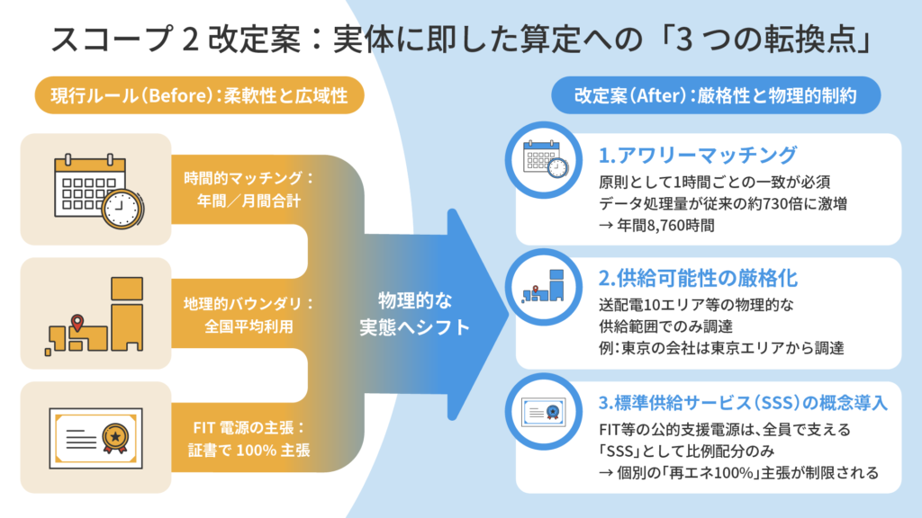 現行のオフサイトPPAは、遠隔地の再エネ電源との契約であっても再エネ達成の根拠として使えました。改定後は同一エリア内での物理的供給可能性の証明が求められる場合があり、PPA契約の設計や地理的条件の考慮が重要になります。
