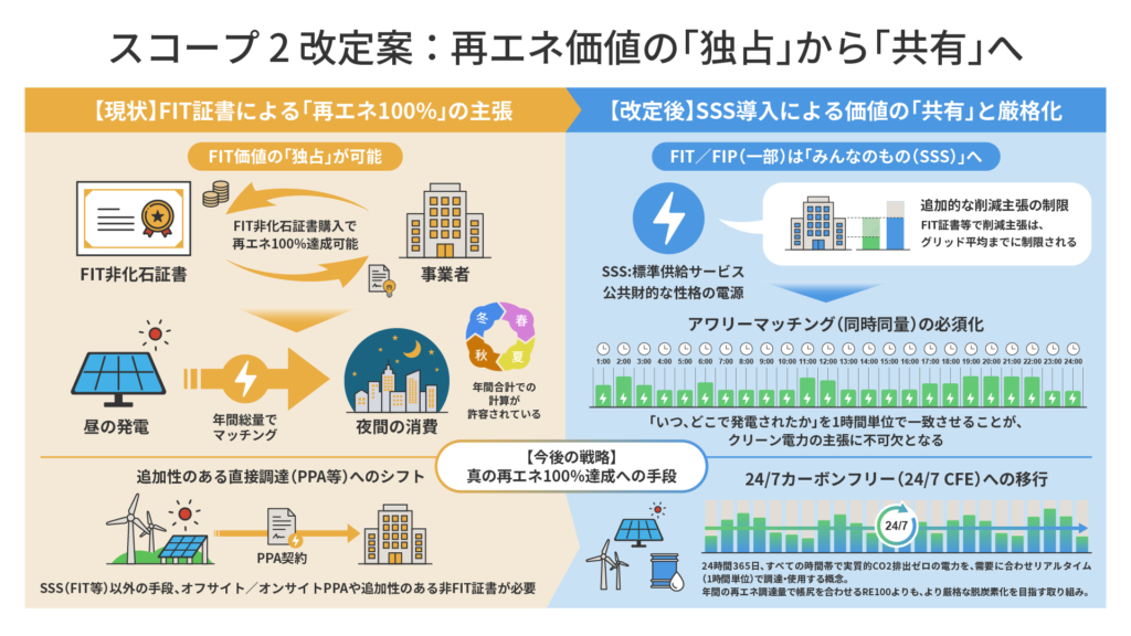 | 自家消費型太陽光 (オンサイト) | 自社発電分はScope2対象外 | 物理的一致が担保されるため優位性が高まる |