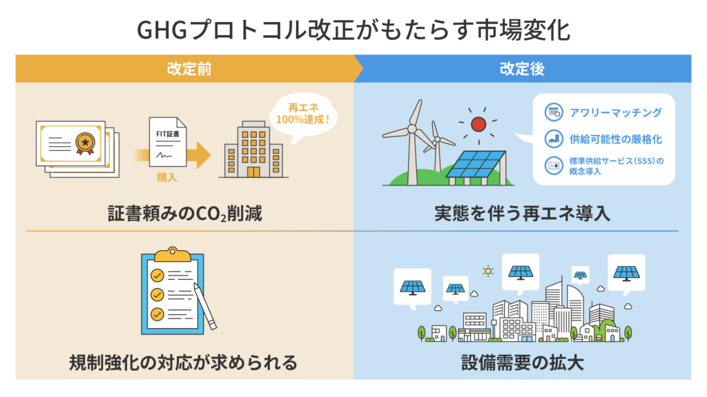 GHGプロトコル改正が正式に施行された場合、顧客企業(工場・倉庫・商業施設等)が再エネ導入を検討する際の要件が変化します。単なる「FIT由来の証書購入」では再エネ達成の根拠として不十分とみなされる可能性があり、より実態を伴った再エネ調達の仕組みへのニーズが高まります。