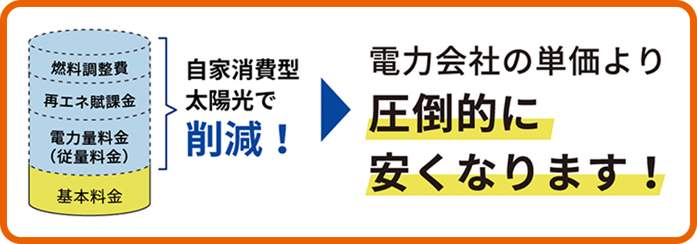 太陽光発電で25年間発電した場合、1kWh当たりの発電コストは10円を下回ることが多く、電力会社の高圧向け単価よりも圧倒的に低コストです。この低コストの電気を優先的に使用することで高額な電気の購入量を抑え、電気料金を削減します。