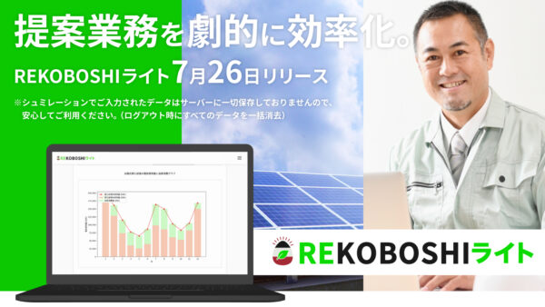 最新情報会社関連太陽光発電プレリリース 会社関連年末年始休業のお知らせ2025年12月5日プレリリース太陽光発電所の発電状況を見える化する 「太陽光モニタリングサービス」をリリース2025年8月6日会社関連お盆休みのお知らせ2025年8月2日会社関連ホームページをリニューアルしました2025年4月8日プレリリース「REKOBOSHI太陽光ポテンシャル⼀括調査サービス」を開始2024年12月20日プレリリース「REKOBOSHI ライト」新機能(蓄電池対応、低圧契約対応)追加のお知らせ2024年8月21日プレリリース自家消費型太陽光発電のざっくりシミュレーション「REKOBOSHIライト」リリース2024年7月26日会社関連社名変更に至るストーリー2023年3月31日太陽光発電太陽光発電所の用地を募集しています【農地歓迎】2023年1月25日会社関連年賀状廃止のお知らせ2022年12月17日 会社関連年末年始休業のお知らせ2025年12月5日会社関連お盆休みのお知らせ2025年8月2日会社関連ホームページをリニューアルしました2025年4月8日会社関連社名変更に至るストーリー2023年3月31日会社関連年賀状廃止のお知らせ2022年12月17日会社関連「福島民報」2022年2月26日号にてご紹介いただきました2022年3月2日会社関連10kW以上の太陽光発電所 制度改正のお知らせ2021年12月21日 太陽光発電太陽光発電所の用地を募集しています【農地歓迎】2023年1月25日太陽光発電11/20放送『池上彰の経済“新”辞典』にてご紹介いただきました2022年11月22日太陽光発電施工を行った「日本初の垂直営農ソーラー」が運転を開始しました2022年5月3日 プレリリース太陽光発電所の発電状況を見える化する 「太陽光モニタリングサービス」をリリース2025年8月6日プレリリース「REKOBOSHI太陽光ポテンシャル⼀括調査サービス」を開始2024年12月20日プレリリース「REKOBOSHI ライト」新機能(蓄電池対応、低圧契約対応)追加のお知らせ2024年8月21日プレリリース自家消費型太陽光発電のざっくりシミュレーション「REKOBOSHIライト」リリース2024年7月26日